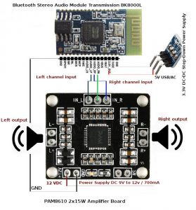 I’m using BK8000L Bluetooth module (SBC audio decoding performance) and as amplifier the PAM8403 board. (but you can use any other amplifier for example from you old PC speaker)