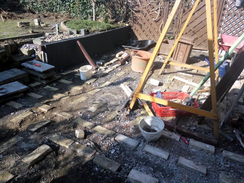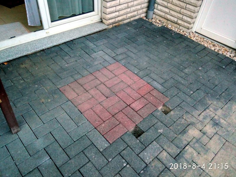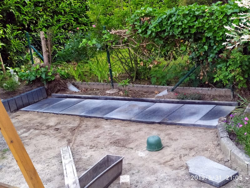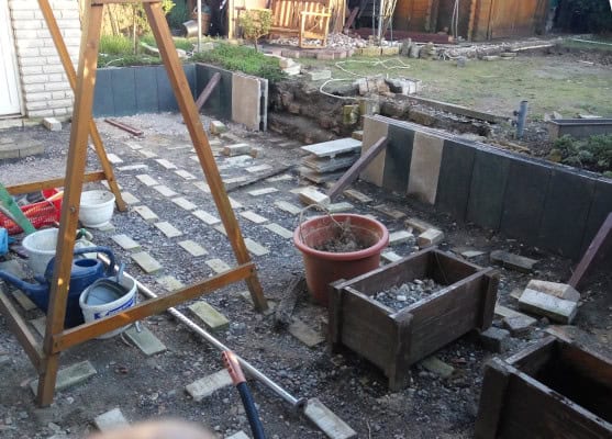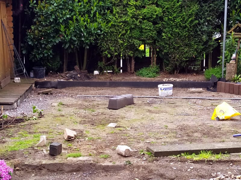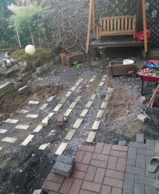 Die alte Pflastersteine dienten zwar gut für neue Fundamente aber wegen der großen Endhöhe der Terrasse müssten wir bestehende Pflastersteine entfernen.