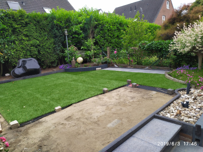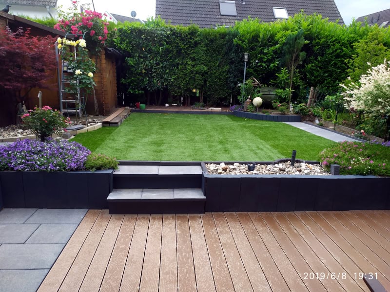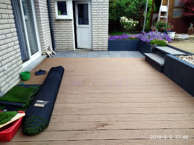 Wie entschieden uns den Boden mit WPC Belägen verlegen und Rasen mit Kunstrassen zu ersetzten.