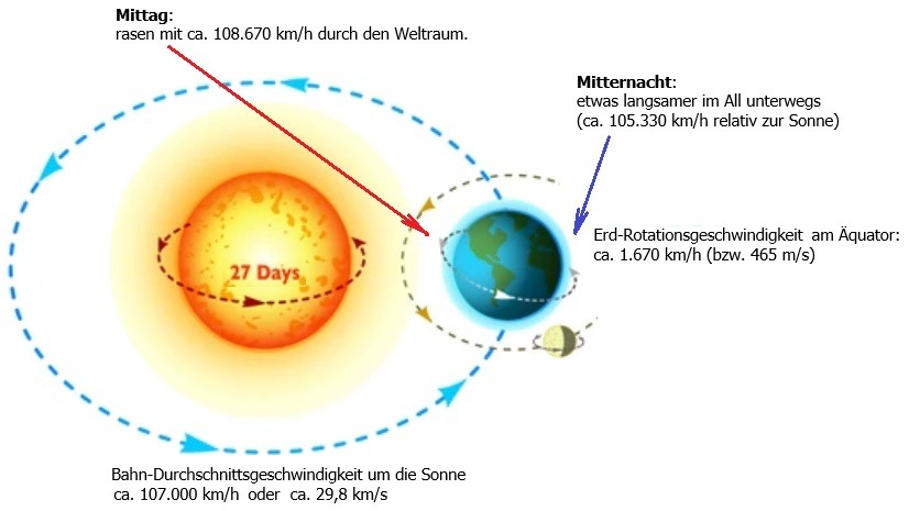 در هنگام ظهر، شما رو به خورشید هستید. در این وضعیت، چرخش زمین در خلاف جهت حرکت مداری آن است.vTotal = vOrbital – vRotational