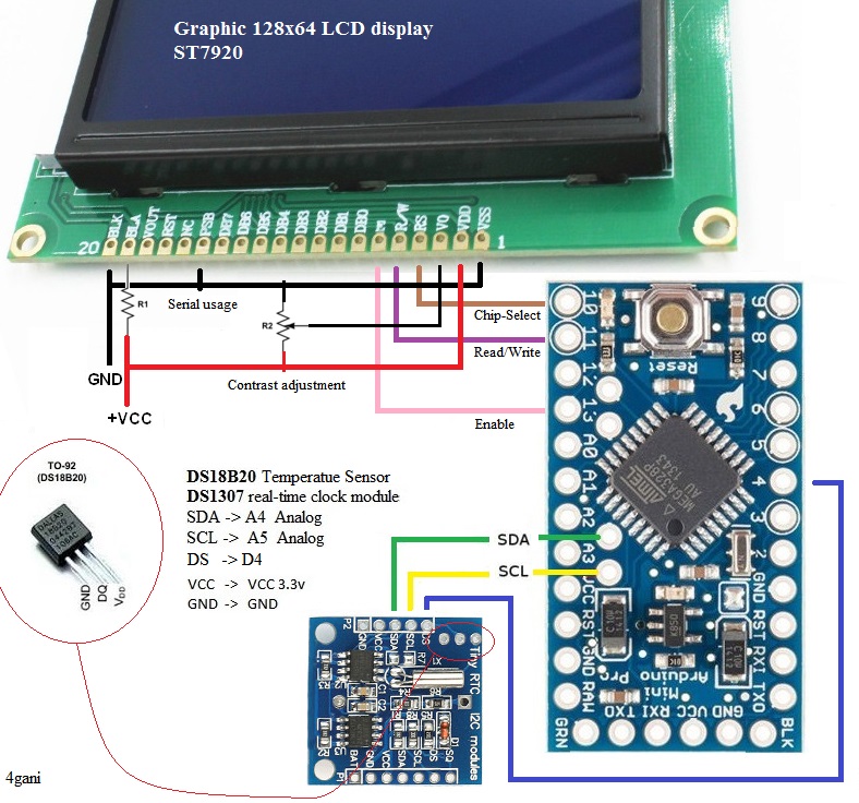 The following provide the instructions for making temperature measurement with a Dallas DS18B20, DS1307 and a LCD 128×64 ST7920.