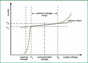 The normal GM operating voltage range is between V1 and V2 (see the diagram).