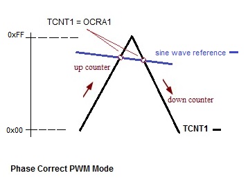 Pulse Width Modulation (PWM), Phase Correct, 8-bit, UP to 0xFF, DOWN to 0x00