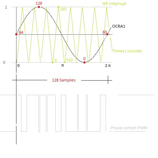To produce a sine wave signal by varying the duty cycle of the PWM signal we use auc_SinParam table (see the code) with 128 samples for a period.