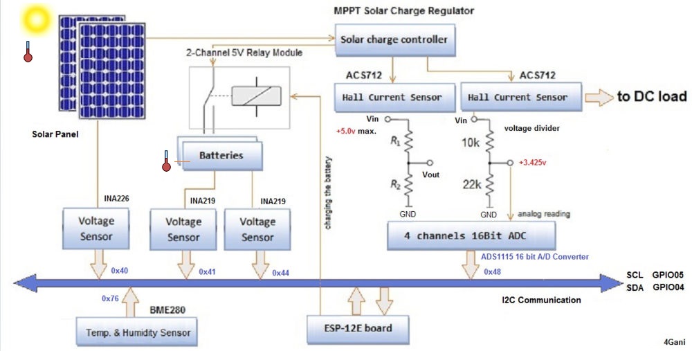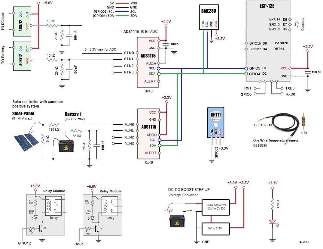 Schematic and Wiring Diagram: (next generation) My controller is positive-grounded. It means the positive of solar, battery and load are hard-wired together inside the unit which makes my life hard. I removed INA219 and INA226 sensors and replaced them with voltage divider and don’t longer use the small USB charging of regulater to power the ESP-12 board. To power the board, I’m using a 12/24 volt to 5/3.3 volt step down module. |
