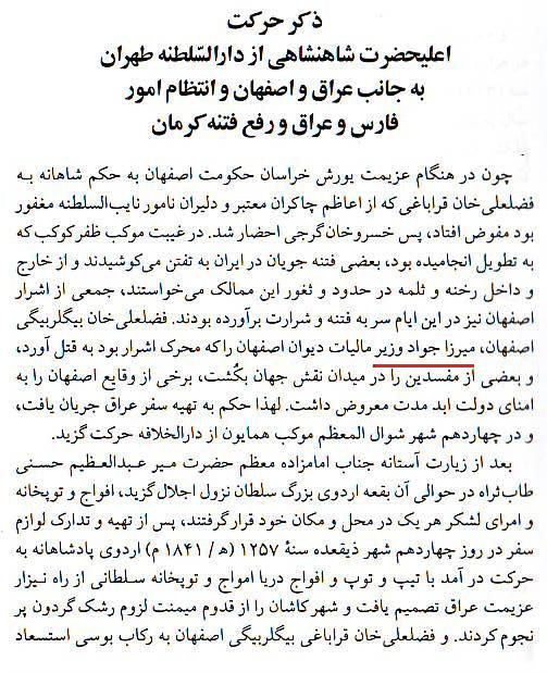 در غیبت موكب ظفرکوکب که به تطويل انجامیده بود، بعضی فتنه جویان در ایران به تفتن می کوشیدند و از خارج و داخل رخنه و ثلمه در حدود و ثغور این ممالک می خواستند، جمعی از اشرار اصفهان نیز در این ایام سر به فتنه و شرارت برآورده بودند فضلعلی خان بیگلربیگی میرزا جواد وزیر مالیات دیوان اصفهان را که محرک اشرار بود به قتل آورد سال 1837,۱۲۱۶ و بعضی از مفسدین را در میدان نقش جهان بکشت